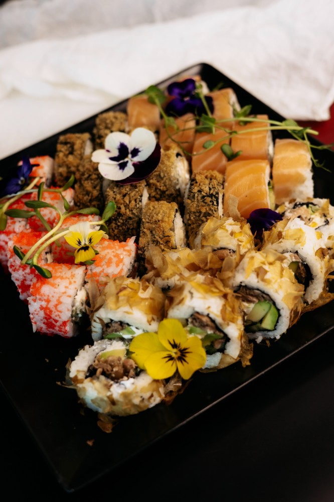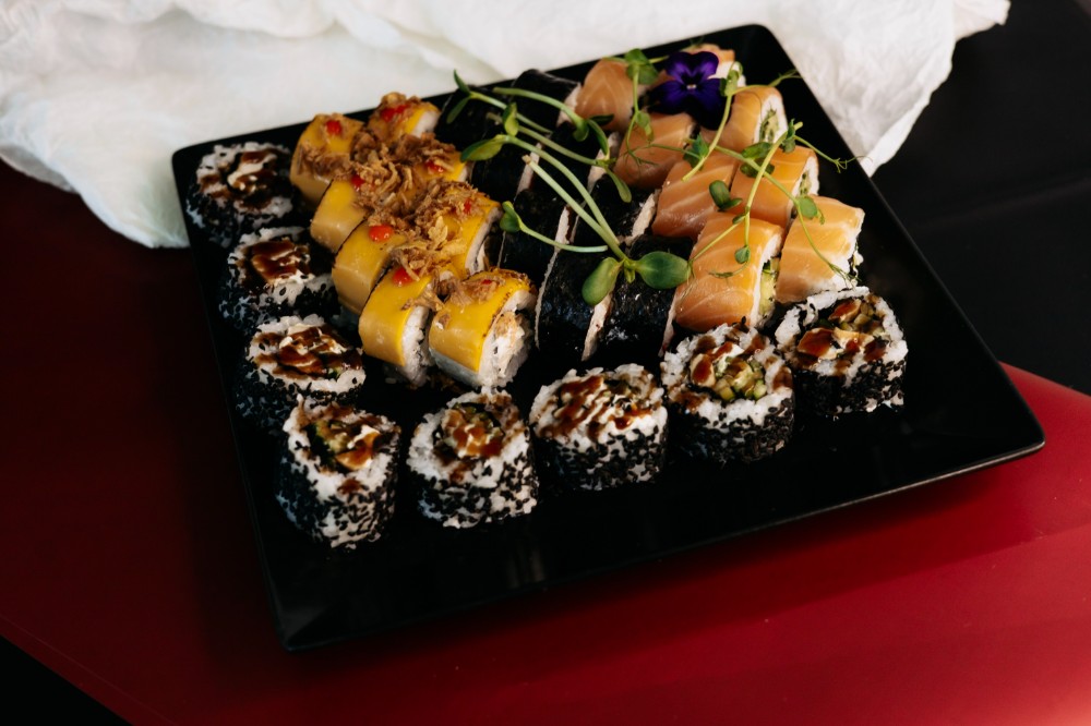 Склад: Black Yami рол-1шт. (грильований лосось, огірок, сир, кранч цибулі), Red Yami рол - 1шт.(лосось, манго, сир, ікра Тобіко), Футомак - 1шт., Макі з Хіяші - 1шт.