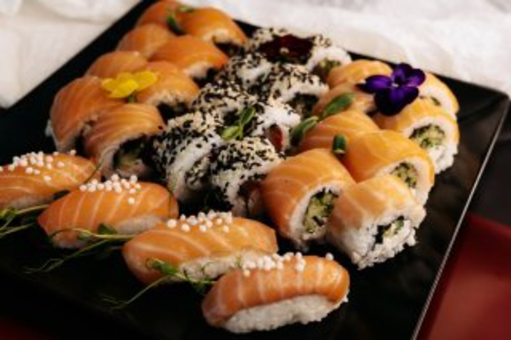 Склад: Норі, Рис, Сир філадельфія, Лосось, Тунець, Авокадо, Хіяші, Горіховий соус.