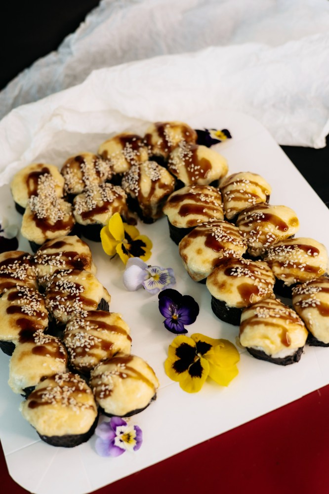 Склад: Норі, Рис, Сир Філадельфія, Огірок, Грильований лосось, Пармезан, сир Моцарелла, Майонез, соус Теріякі.